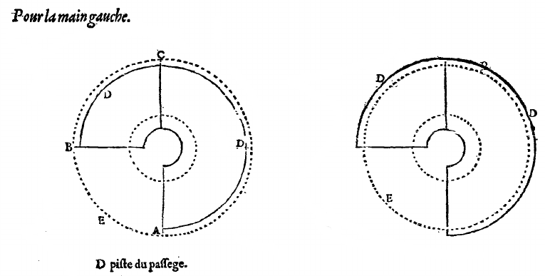 Beim Trainieren dieser ersten Genauigkeit im Schritt auf jeder Hand, muss man von Demi-Volte zu Demi-Volte langsam die Linie und den Abstand der Demi-Volten mit